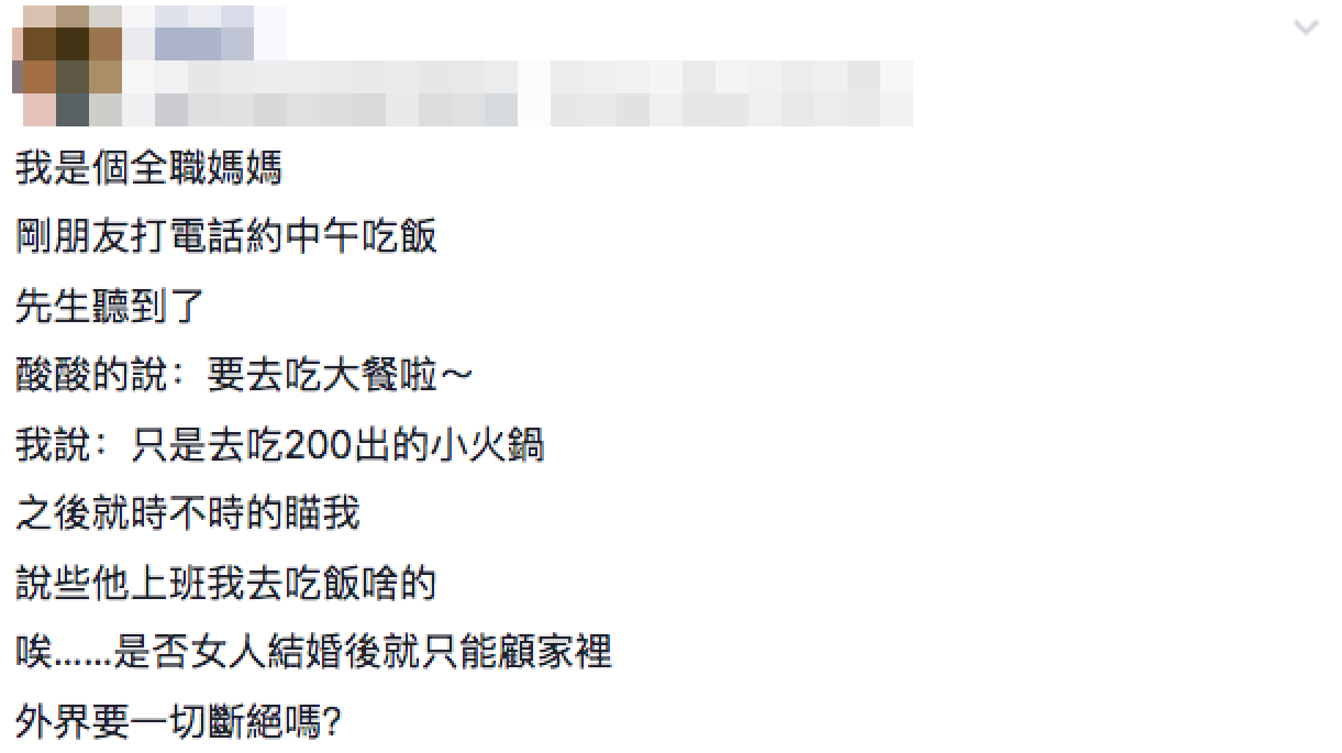 女人婚後的生活就一定要跟外界隔絕?臉書社團一名全職媽媽只是約朋友吃午餐,沒想到丈夫得知後竟然開始酸言酸語,讓她非常不舒服,忍不住情緒上網宣洩「是否女人結婚後就只能顧家?」。