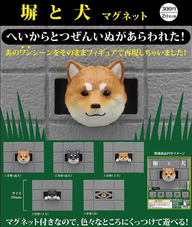 ▼專門推出趣味扭蛋作品的「奇譚俱樂部」(キタンクラブ)就以「牆縫狗」(塀と犬)為主題,推出了5款「從牆洞探出頭的柴犬」磁鐵轉蛋。因為是磁鐵設計,拿回家後可以在冰箱等地方重現「壁犬」畫面,是不是很可愛?
