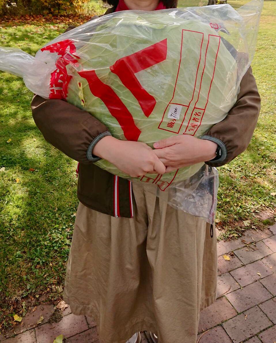 ▼北海道不僅風景優美,農業也很發達,擁有日本1/4的農地,是日本很重要的糧食提供基地。札幌有一種叫「札幌大球」的傳統農作物,這是一種巨無霸高麗菜,每一顆高麗菜的直徑能達到50到60公分,重量超過10公斤,是普通高麗菜的10倍還要多。這名女網友就買了一顆「札幌大球」,一路從北海道提回東京!