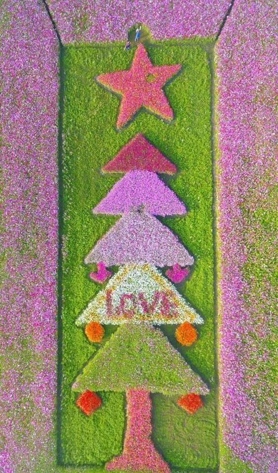 ▼副展區是以花田為主角,包括向日葵、百日草、波斯菊等等各式各樣的花毯通通都在這裡,有茶壺造行的「迎賓奉茶」、蝴蝶、星星等多種圖案,還有全場最大亮點,就是這長達43公尺的聖誕樹形狀花田,使用空拍機就能拍出這壯觀的美照!