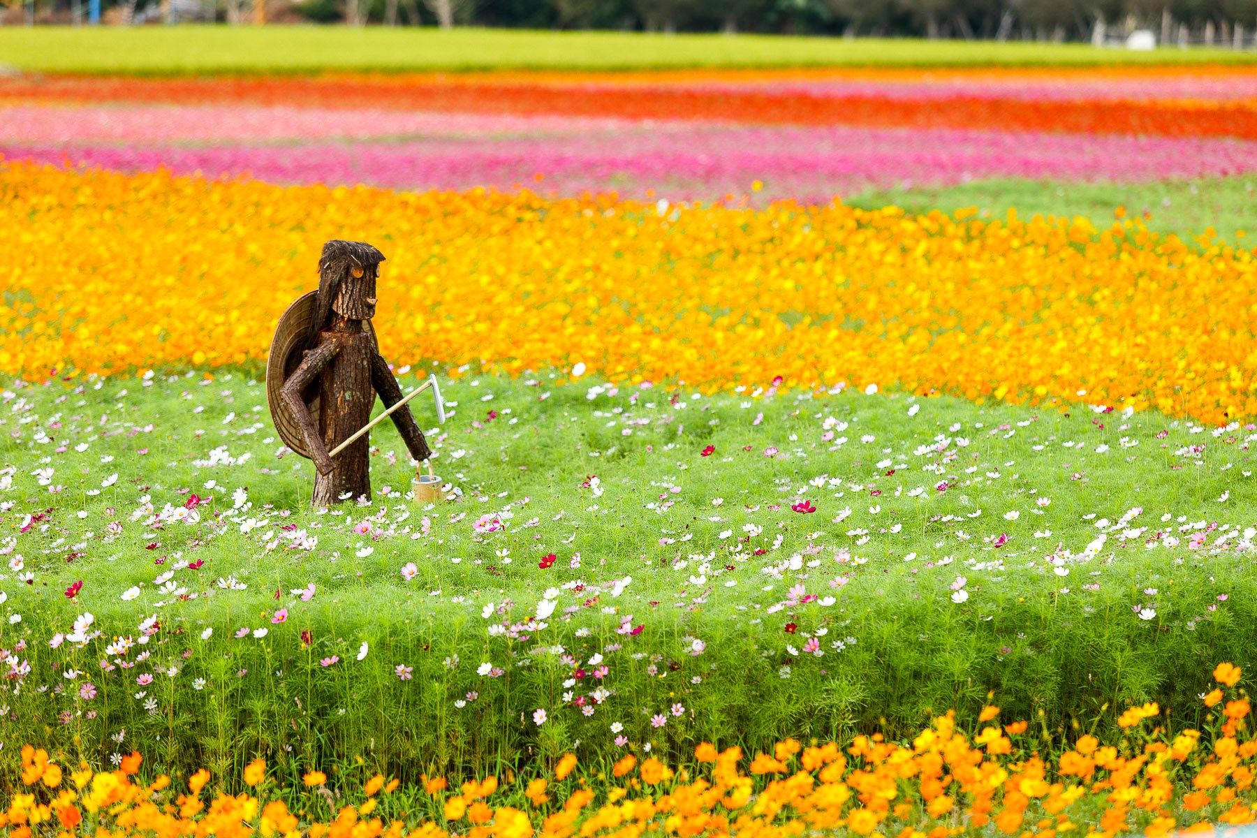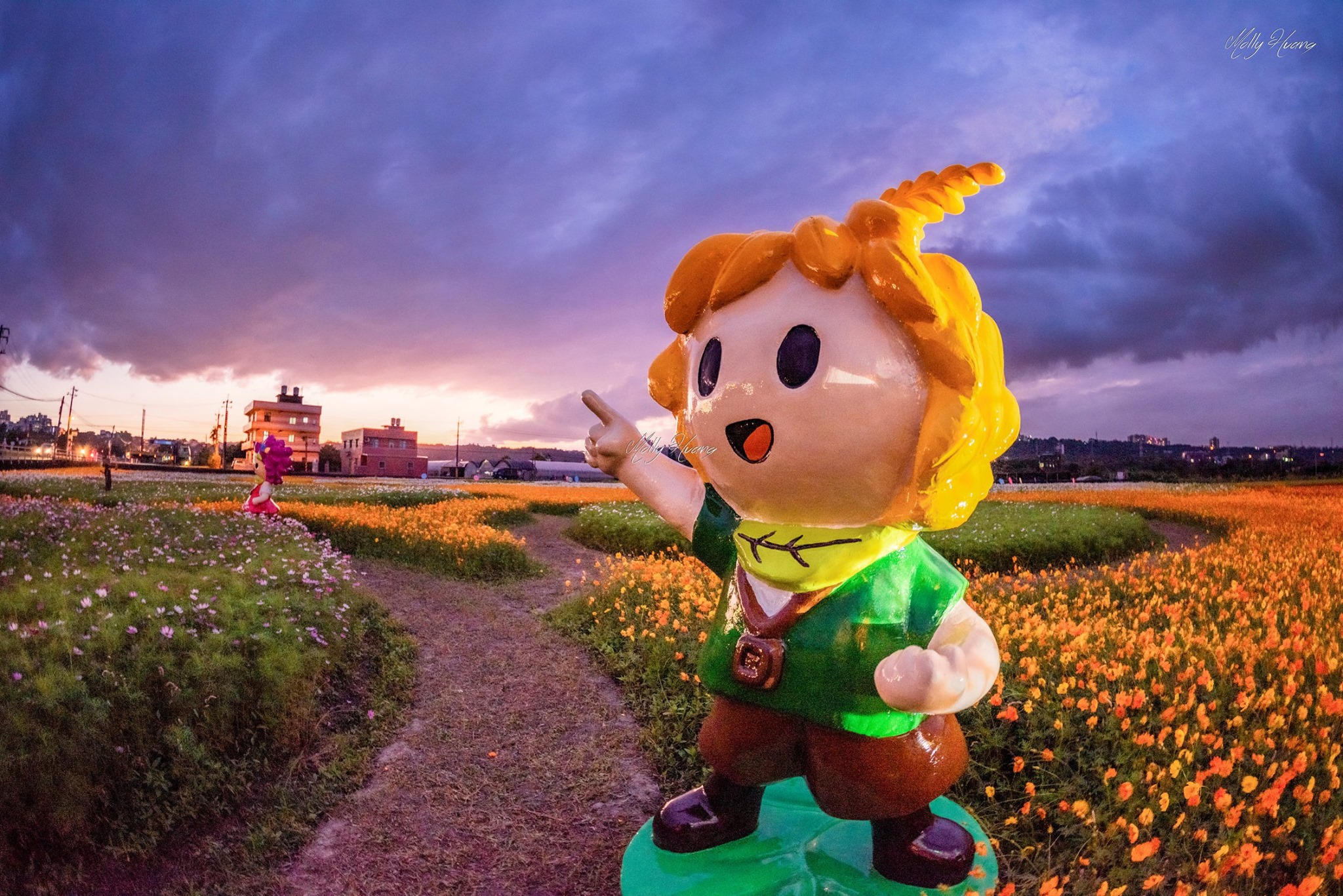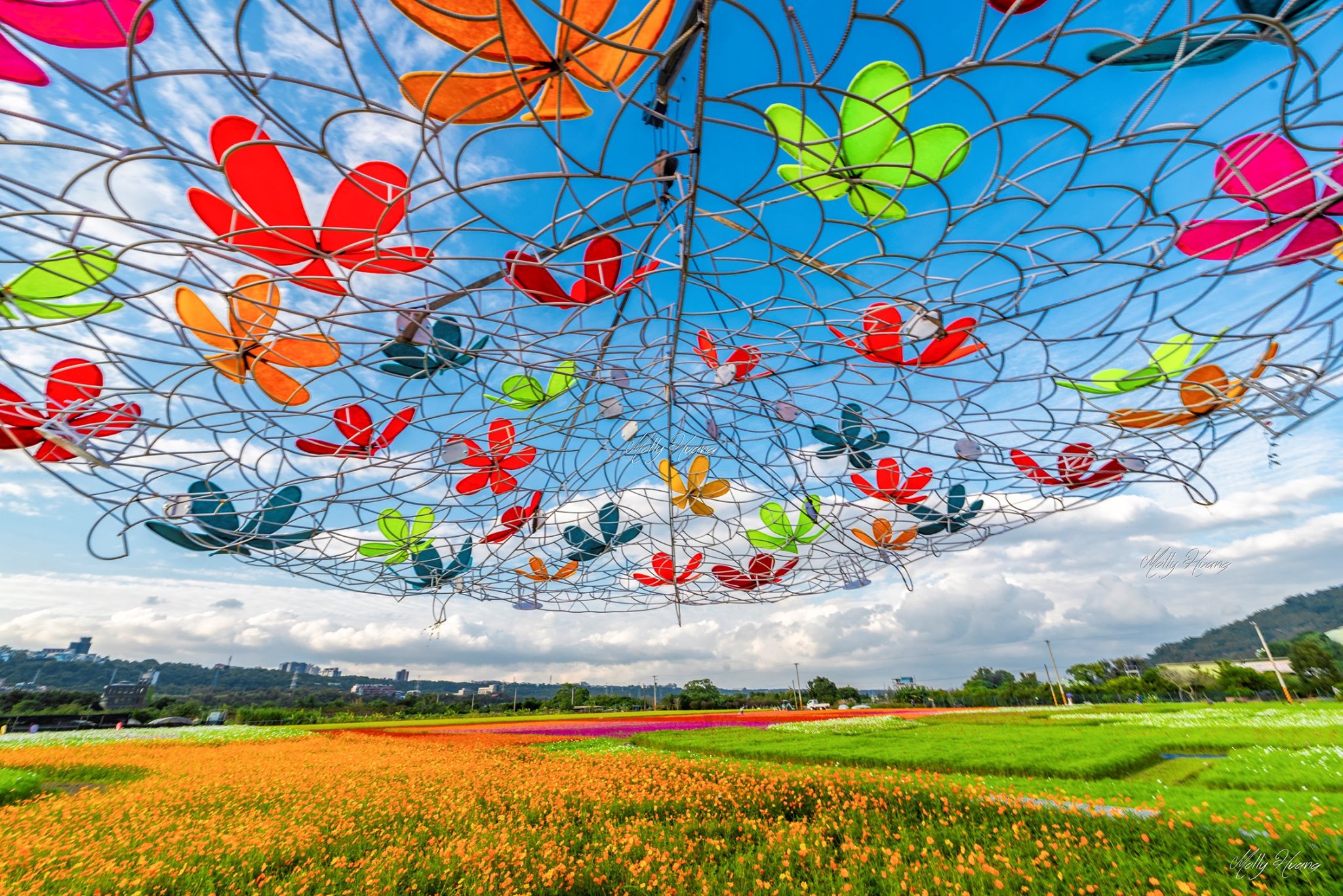 ▼在月眉一帶花田有20公頃,將原本的休耕田,變身成各式各樣的造型花毯,把花朵變成顏料,在大地上大筆揮灑,變成一幅幅美麗動人的花海美景!一望無際的波斯菊花田,壯麗程度絕對是來到現場才能感受到!