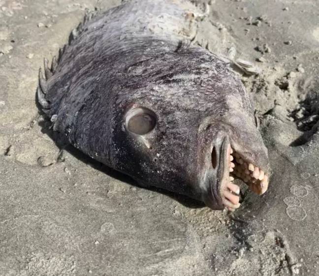 ▼幾個月前,美國喬治亞州聖西蒙島也出現了一條「人面魚」。當時31歲居民Maleah Burrows帶著3歲的兒子到海岸散步,沒想到在沙灘上看到了一條大魚。牠身上的鱗片掉了不少,張開的嘴巴裡露出整排牙齒。Maleah被嚇到,連忙將魚的照片po到了社群網站上。