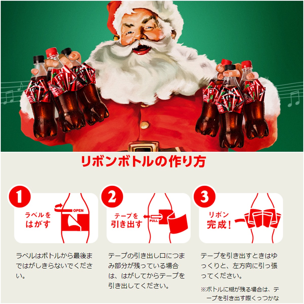 ▼日本可口可樂一直在口味和包裝上求新求變。往年聖誕節推出的「蝴蝶結包裝」,讓人早早就感受到聖誕節的氣氛。只要單手拉開塑膠標籤,就能變成華麗的蝴蝶結,整個瓶子就能成為一份超棒的禮物。