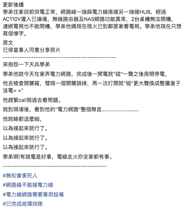 學弟DIY「亂接電力線網路」整間跳電 網問:這是接到天國的線?