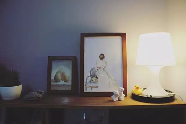 ▼卧室中有一些原木材質的小件物品。再把之前的水彩作品裝裱起來,掛到牆上。