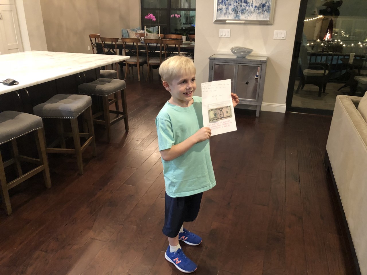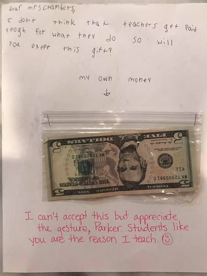 ▼Parker是佛羅里達州的一名3年級小學生。今年他過生日時,父母不僅給他準備了禮物,還給了他15美元(約台幣456元)紅包。但Parker沒有把這筆錢存起來,更沒有買東西,而是將它裝進塑膠袋裡,並附上紙條說:「致親愛的Chambers老師,我覺得老師的薪水跟你們的付出不成正比。你可以收下我這份禮物嗎?」