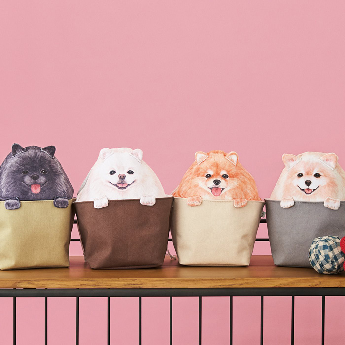 ▼最後是四種花色的「博美造型置物籃」,像是博美趴在籃子上耍萌,像這樣一字排開是不是可愛到想立刻帶回家呢~