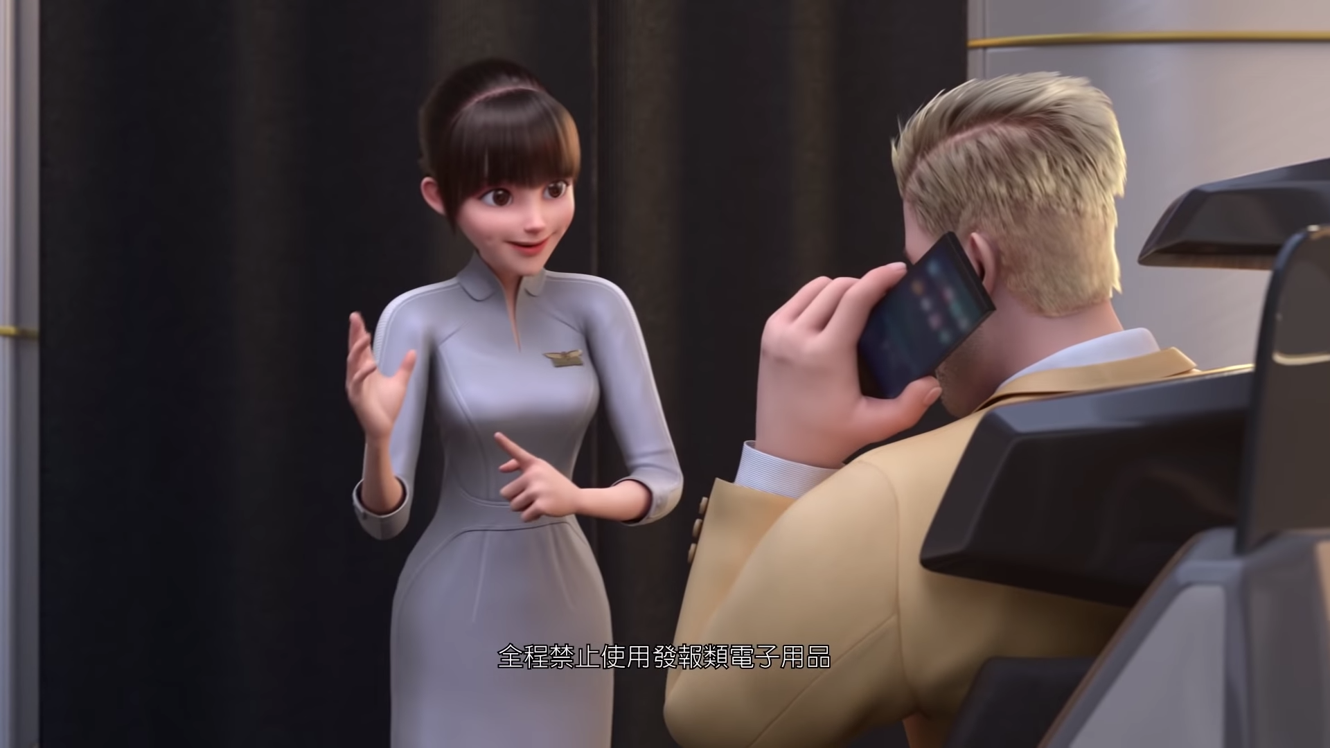 ▼機上安全影片以雙語方式呈現,提醒乘客要關手機、繫安全帶,角色動作活靈活現,一點也不會呆板。其中的空服員更是具有台灣人的外觀特色,仔細看還有笑起來的酒窩!