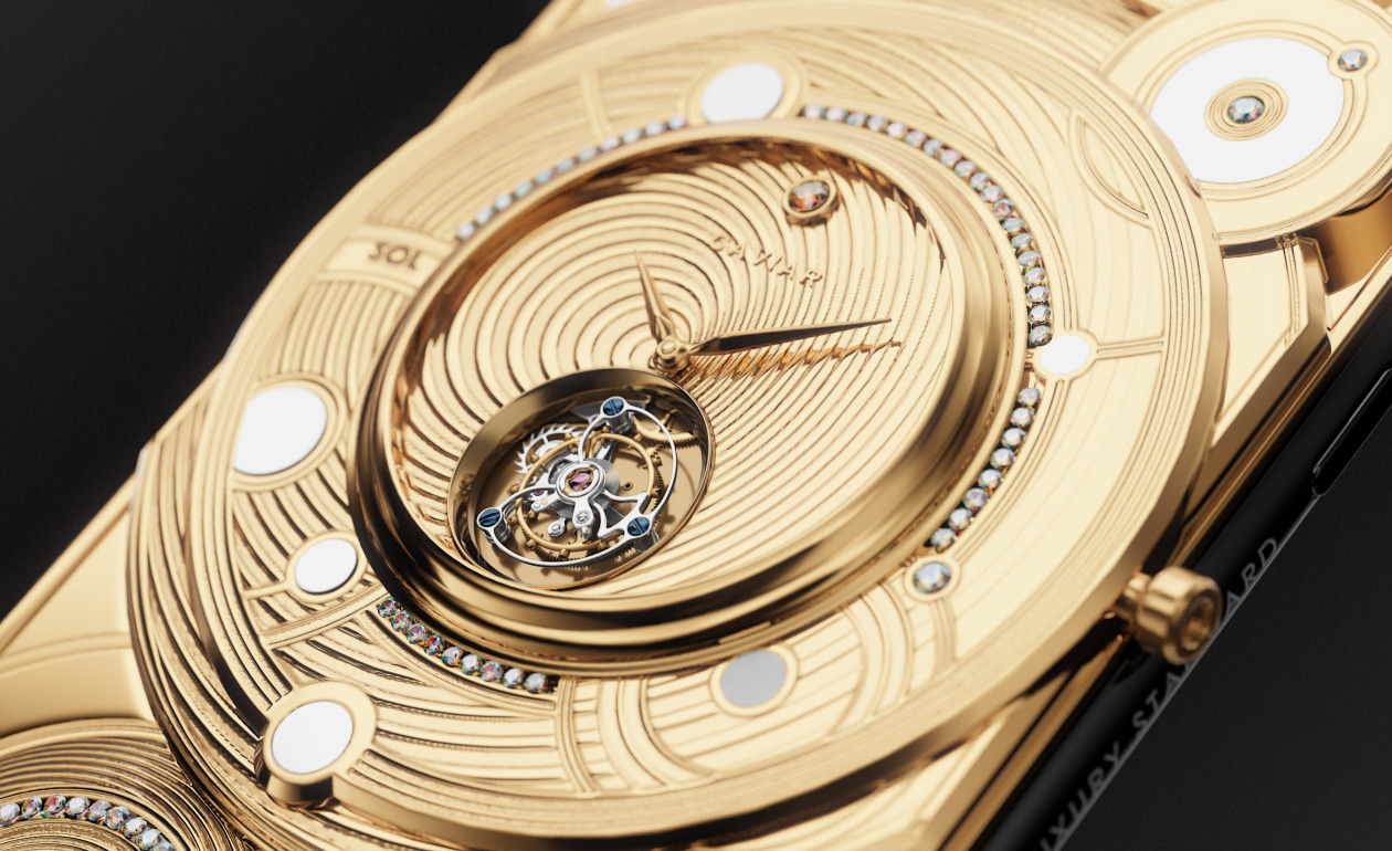▼在含有純金的背殼上有個指針,12點位置正是一顆稀世黃鑽,下方是一個同樣鑲鑽的陀飛輪,周圍則以鑽石作為排列點綴。