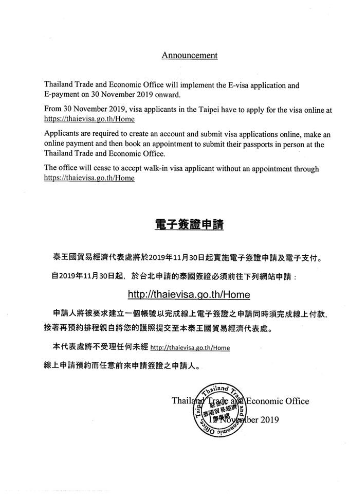 ▼之前台灣民眾想要辦理泰國旅遊簽證時,都可以直接前往辦事處進行辦理,不過泰國觀光局台北辦事處在近日發出了公告,宣佈從11月30日起將實施電子簽證申請及電子支付,未來也將不會受理沒有經過線上預約就直接前往辦理的案件。