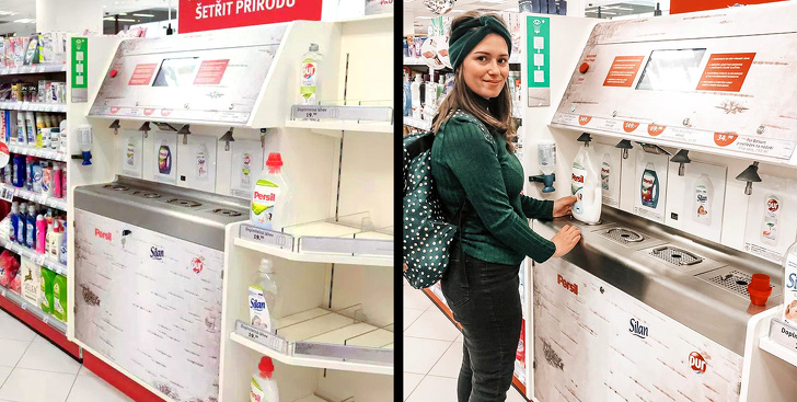 ▼捷克共和國推出填裝洗髮精、沐浴乳的機器,讓大家攜帶空瓶子來裝,不必每次都購買新的。