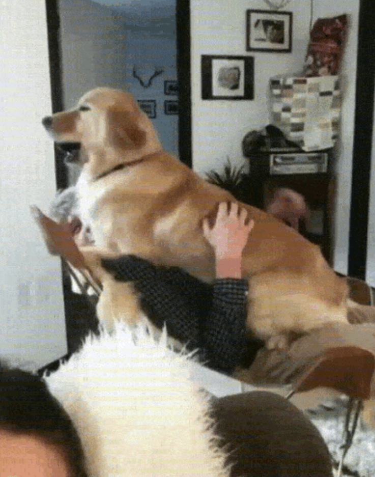 ▼雖然很吃力,但是看到狗狗的萌臉,又實在不忍心推開牠啊~