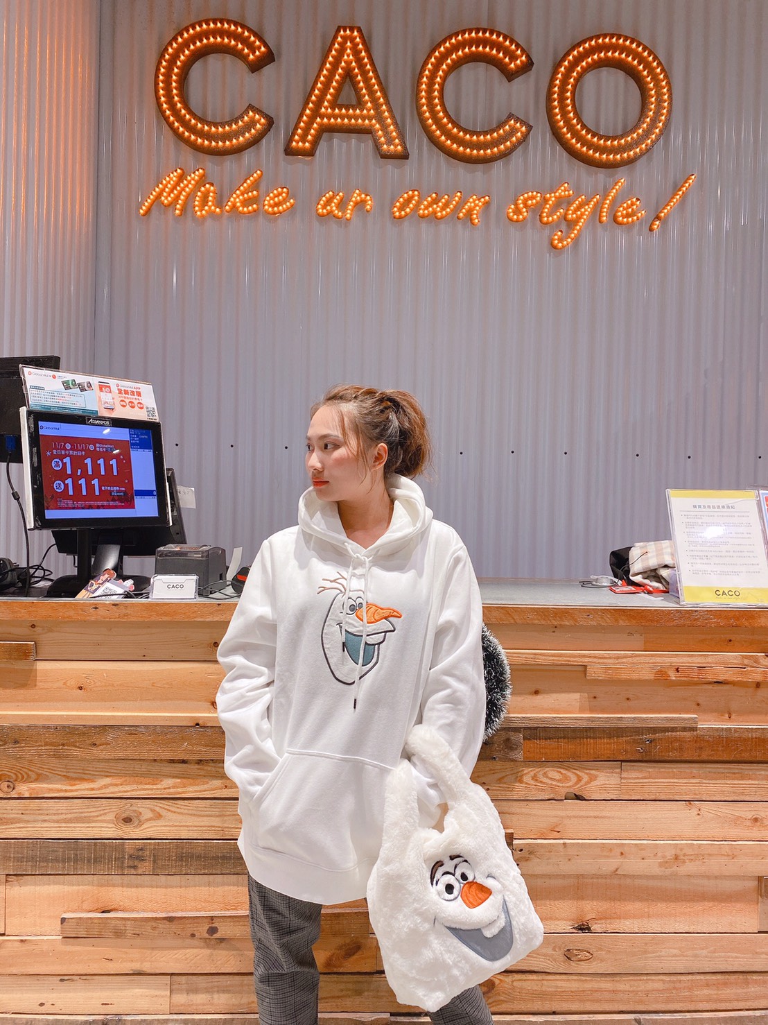 ▼Global Mall內各櫃位推出冰雪奇緣系列周邊,其中CACO推出兼具時尚潮流與可愛的雪寶帽T,消費滿2500元還送雪寶毛絨包,絕對是這一波必收商品!