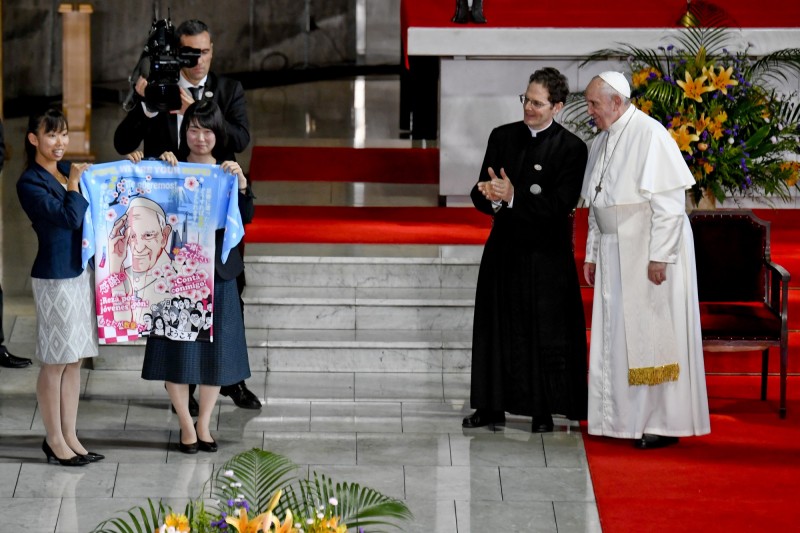 ▼方濟各與日本德仁天皇會面後,中午前往東京聖瑪利亞主教座堂參加青年會談,現場非常多教徒迎接。