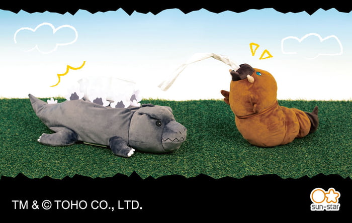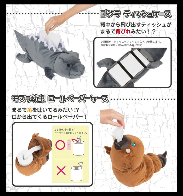 哥吉拉系列電影的第一部作品在1954年上映,如今已經過去65年,這隻潛藏海底的太古怪獸仍舊人氣超高。日本SUN-STAR文具公司推出了一系列怪獸主題的衛生紙套,包括哥吉拉和摩斯拉幼蟲造型,看起來竟然很可愛。