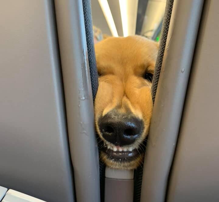 ▼Huxley將頭卡在兩張座椅中間,伸長舌頭想要舔主人手裡的餅乾。牠臉上的肉肉都被擠成一堆,表情格外可愛。最後Huxley討餅乾的行動失敗了,但這沒有影響牠的心情,牠很快又跟旁邊的乘客玩了起來。