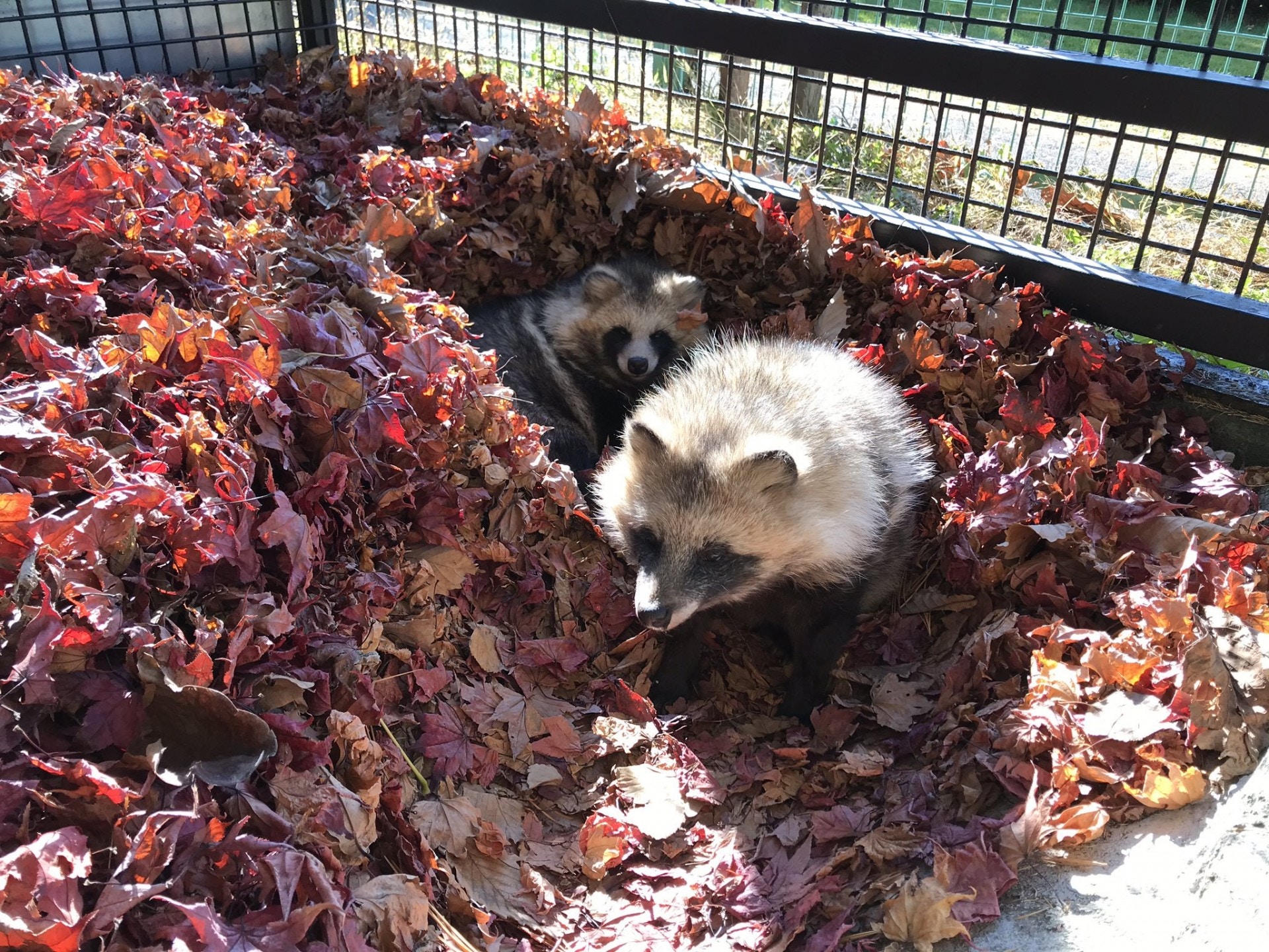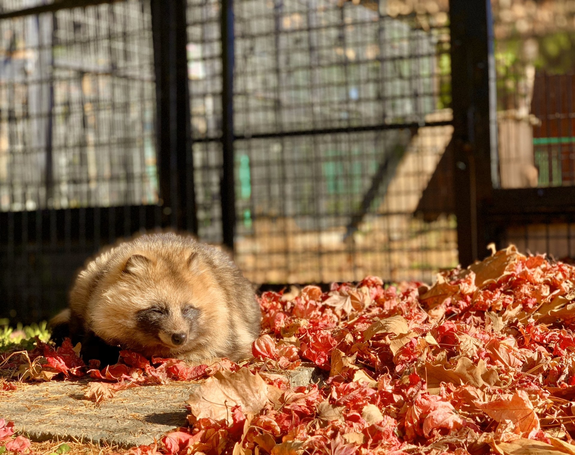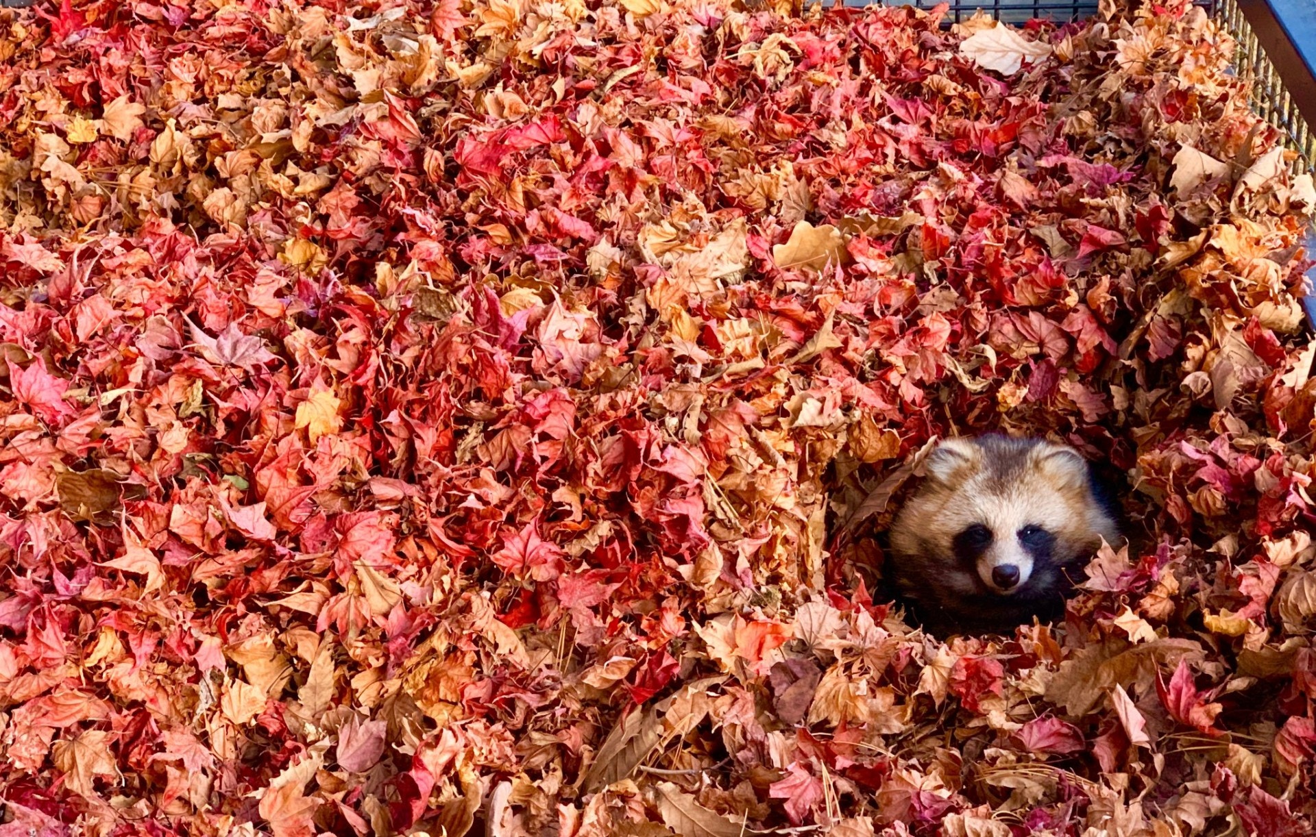▼浣熊們沒有辜負工作人員的心意,有時躺在紅葉堆中休息,有時在其中玩耍,非常有趣。