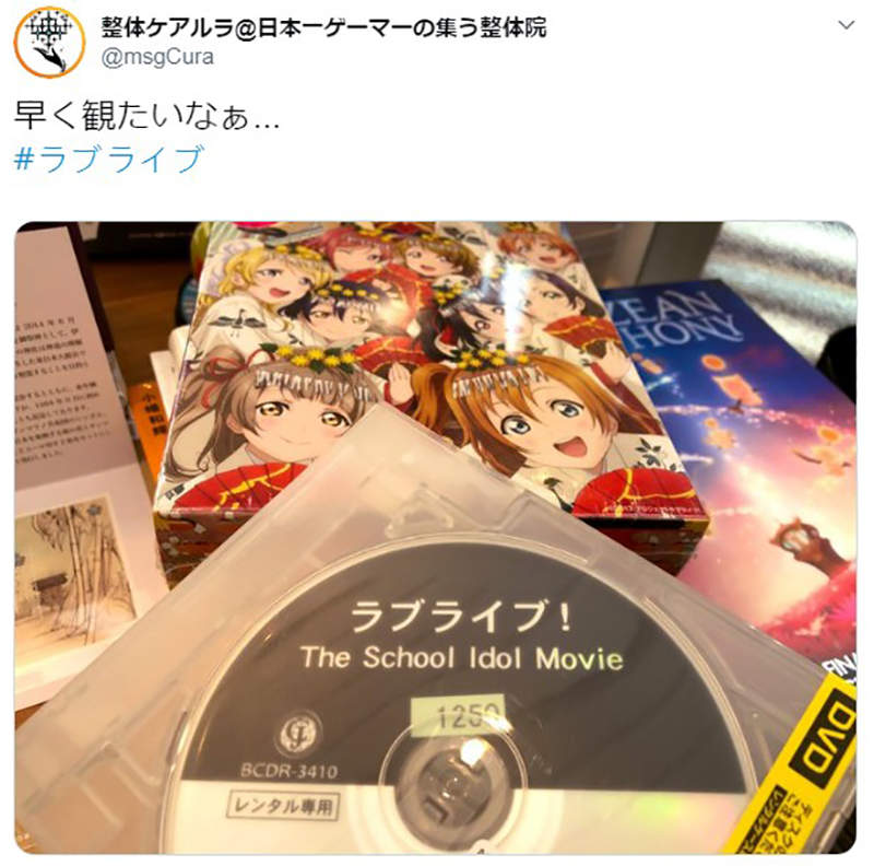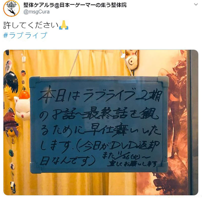 2019年11月29日日本東京一間整體店「整体ケアルラ」的老闆成為網路話題,因為他居然為了追看經典的偶像動畫《LoveLive!》而決定提早關店追動畫!客人走到店門口看到牌子上寫的內容都當場傻眼貓咪。