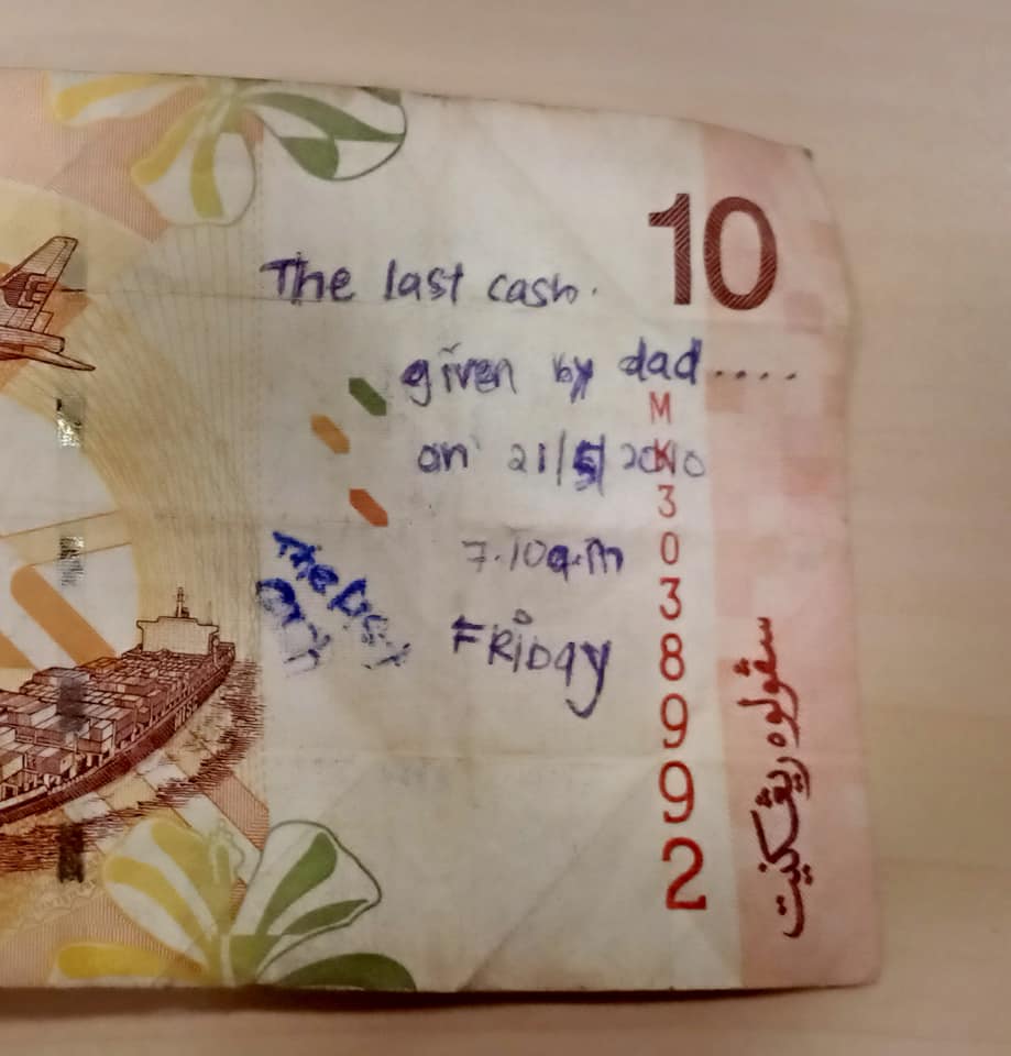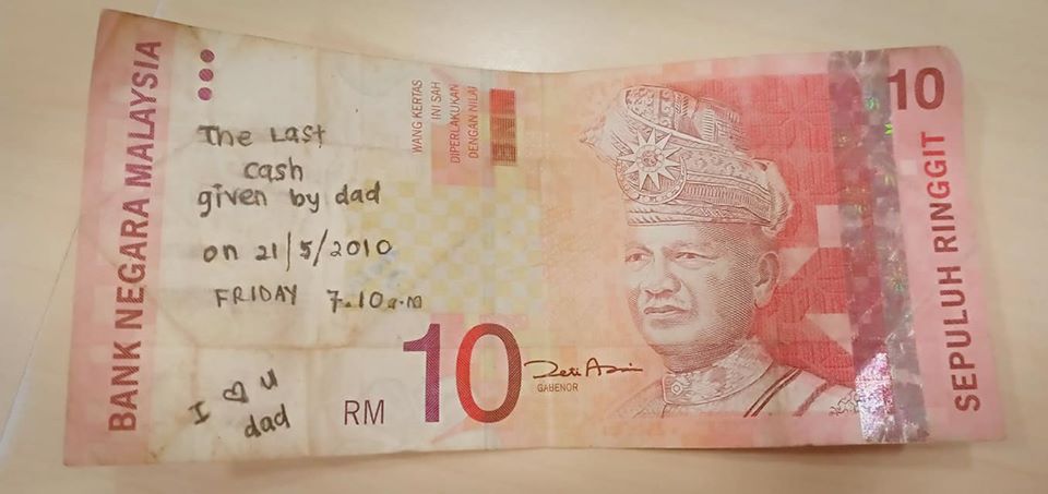 ▼可以看到這張馬幣10元的鈔票上,用英文寫著「爸爸給我的最後一筆錢,2010年5月21日星期五,早上7點10分。爸爸我愛你!」的字眼。