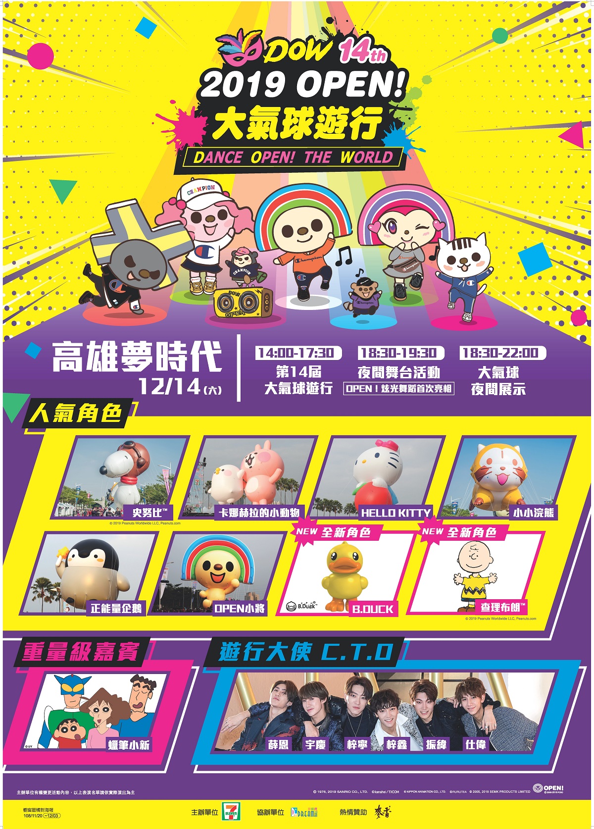 2019年12月05日全台規模最大的卡通氣球遊行終於強勢回歸啦!「2019 7-ELEVEN OPEN!大氣球遊行」將於12月14日在高雄時代大道登場,活動當天更將有20組卡通大氣球、高達千位表演團隊一起踩街同樂,還有查理布朗、蠟筆小新及B.DUCK小黃鴨的大氣球首度亮相~一年一度的卡通氣球遊行一定要衝一波啊!