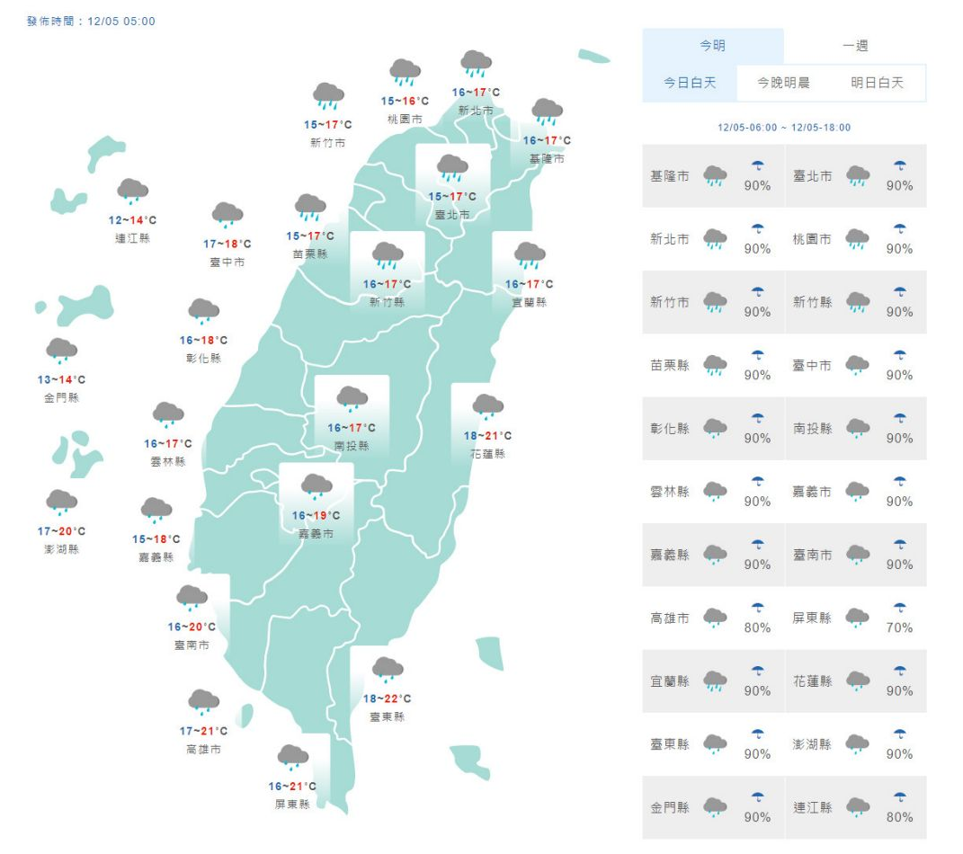 2019年12月05日冷天氣好有感!由於受到東北季風及南方雲系影響,全台都不斷下雨,其中北部和東北部甚至還有豪雨發生的機率!根據中央氣象局指出,由於降雨時間長,天氣會給人有濕涼的感覺。