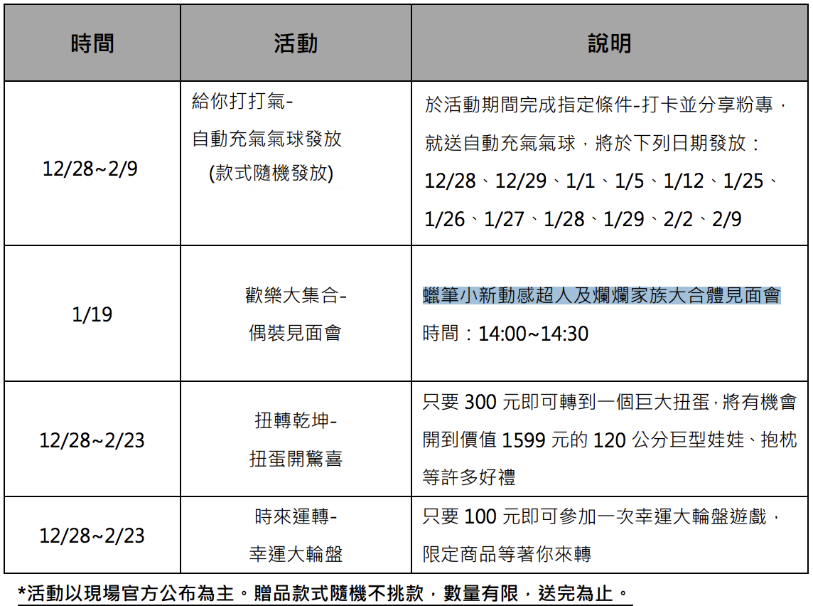▼快閃期間也將舉辦各式各樣的活動,包括小朋友會超嗨的偶裝見面會、有機會抽到驚喜好禮的幸運大輪盤等,詳細活動時間可參考下表。
