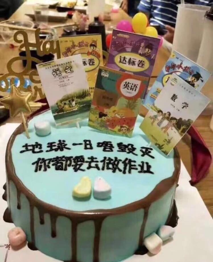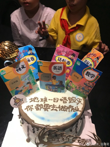 ▼這名小壽星大約六七歲,他面前的生日蛋糕上沒有可愛的卡通人物,反而立滿了好多科目的作業,語文、英語、數學應有盡有,蛋糕上還寫著一句話:「地球一日不毀滅,你都要去做作業」。原本應該最醒目的「Happy Birthday」牌子被擠在後面,都要看不到了。