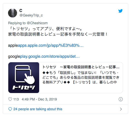 ▼「『トリセツ(使用說明)』這個app也很方便~可以一次管理家電說明書跟評價文章。」
