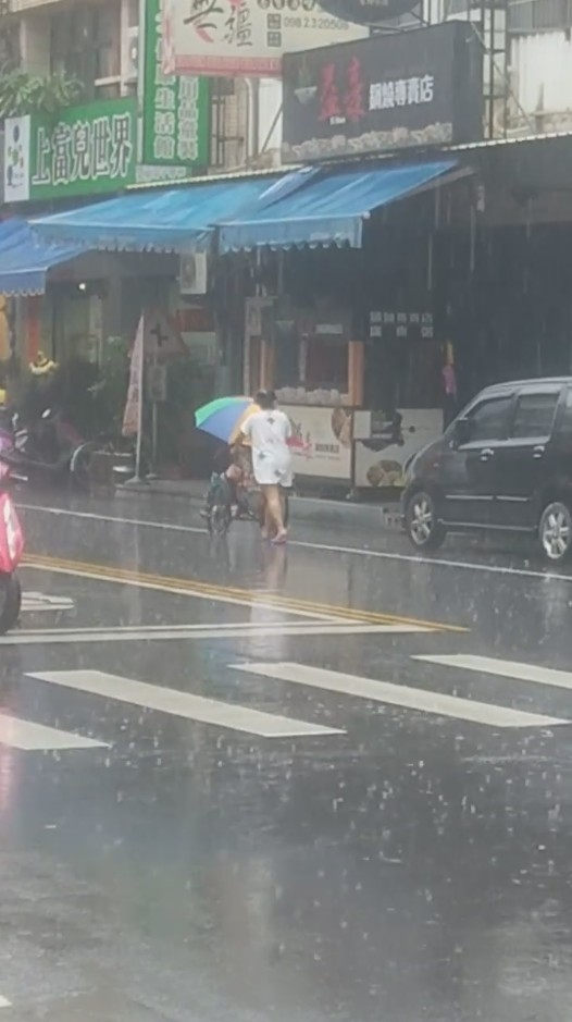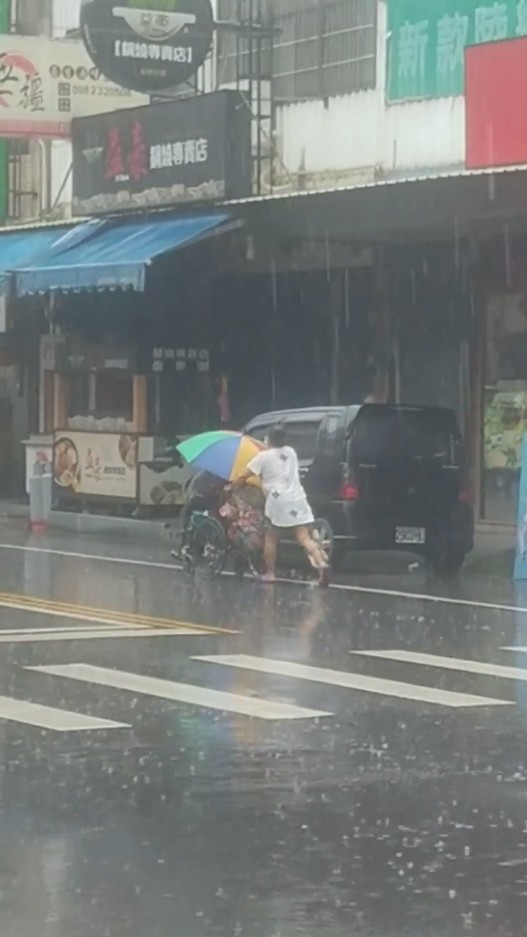 ▼日前有女網友在臉書社團上分享了一段影片,只見在滂沱大雨的街道上,一名僅穿著短袖短褲的看護正在推著長者的輪椅,而唯一的一把大傘就讓長者撐在身上,看護不顧大雨將自己淋濕,這個畫面讓人看了非常感動。