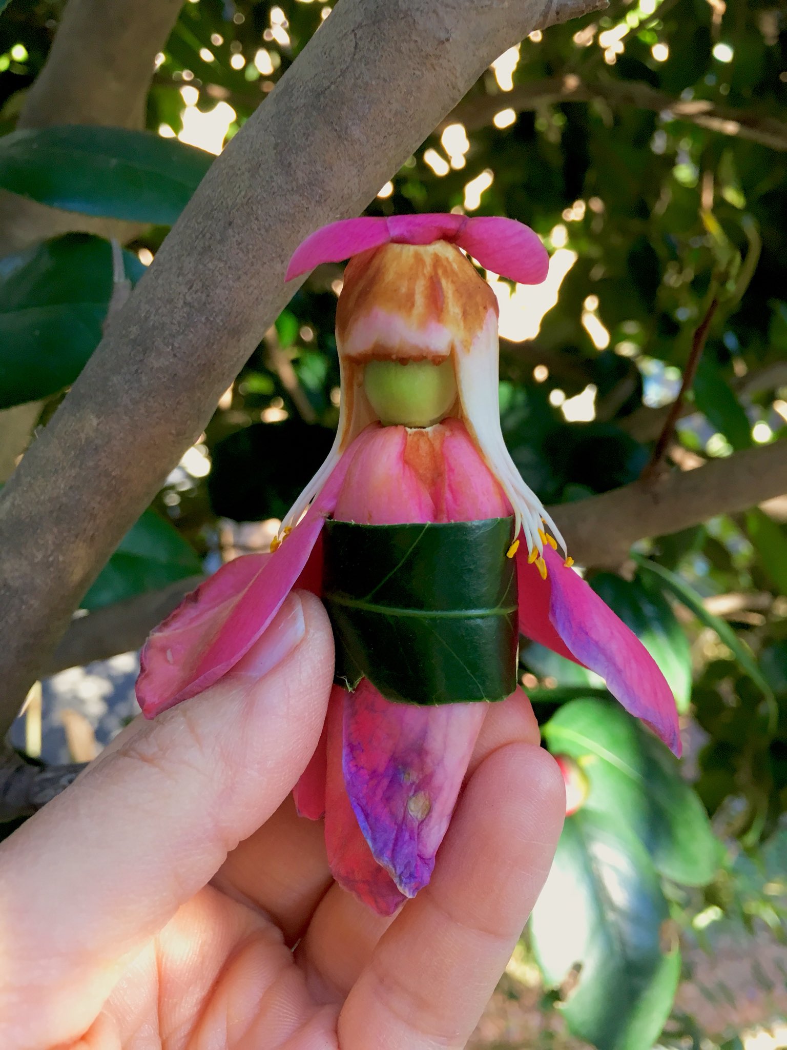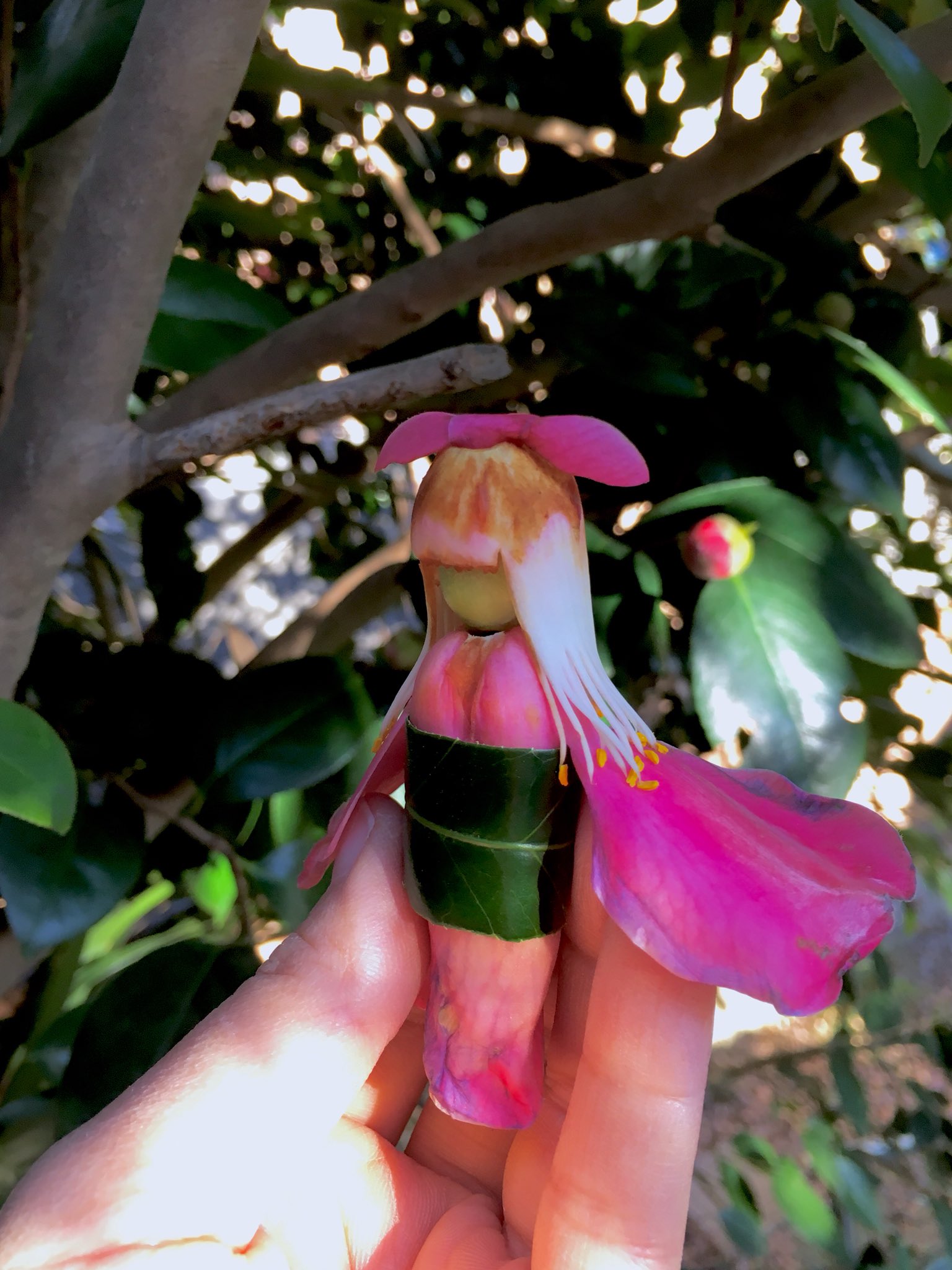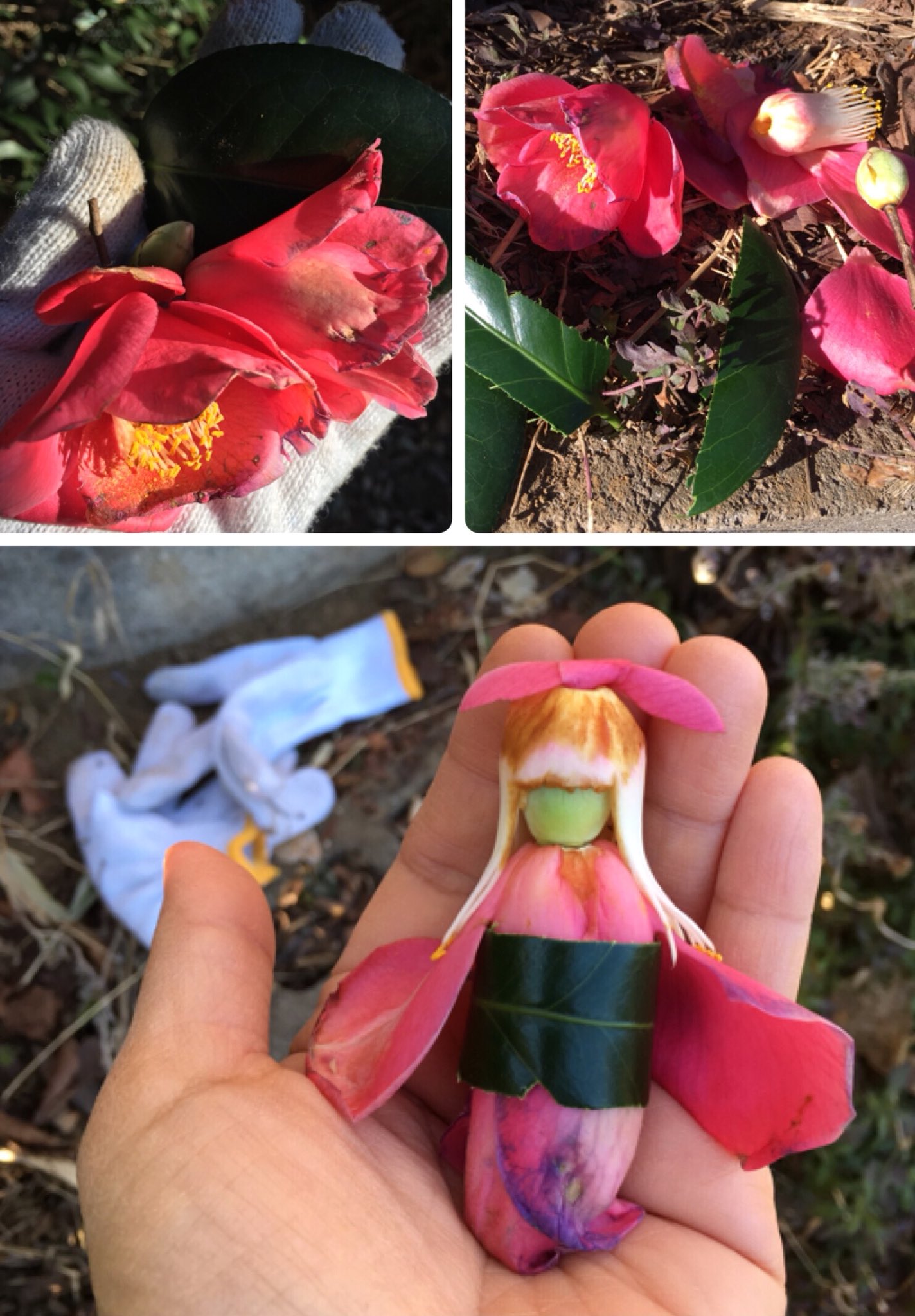椿の花の雄しべを切るときに葉っぱのギザギザを使っているのは爪で切ると爪が黒くなるからです。