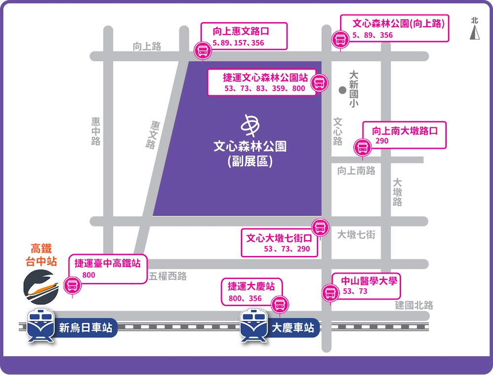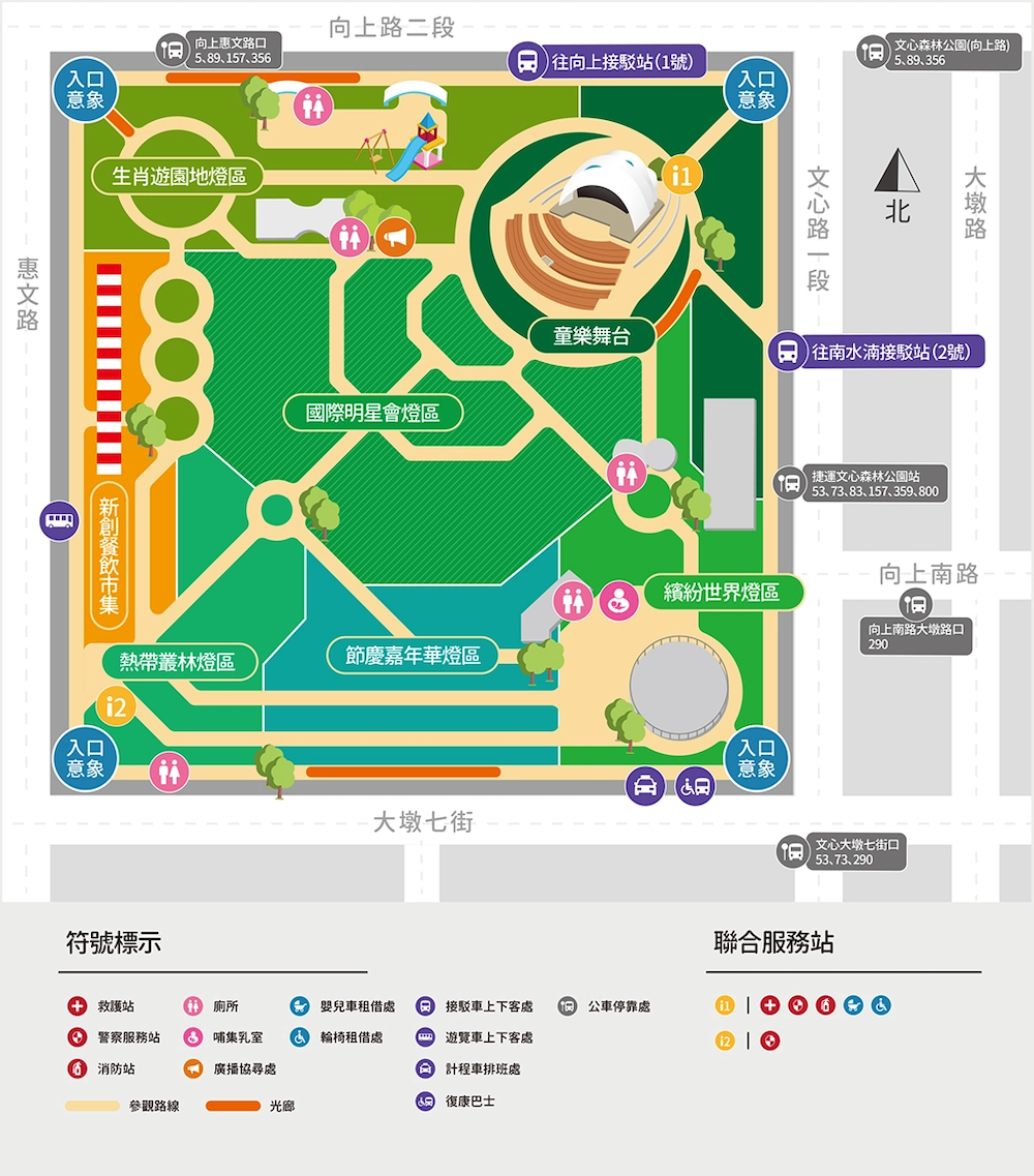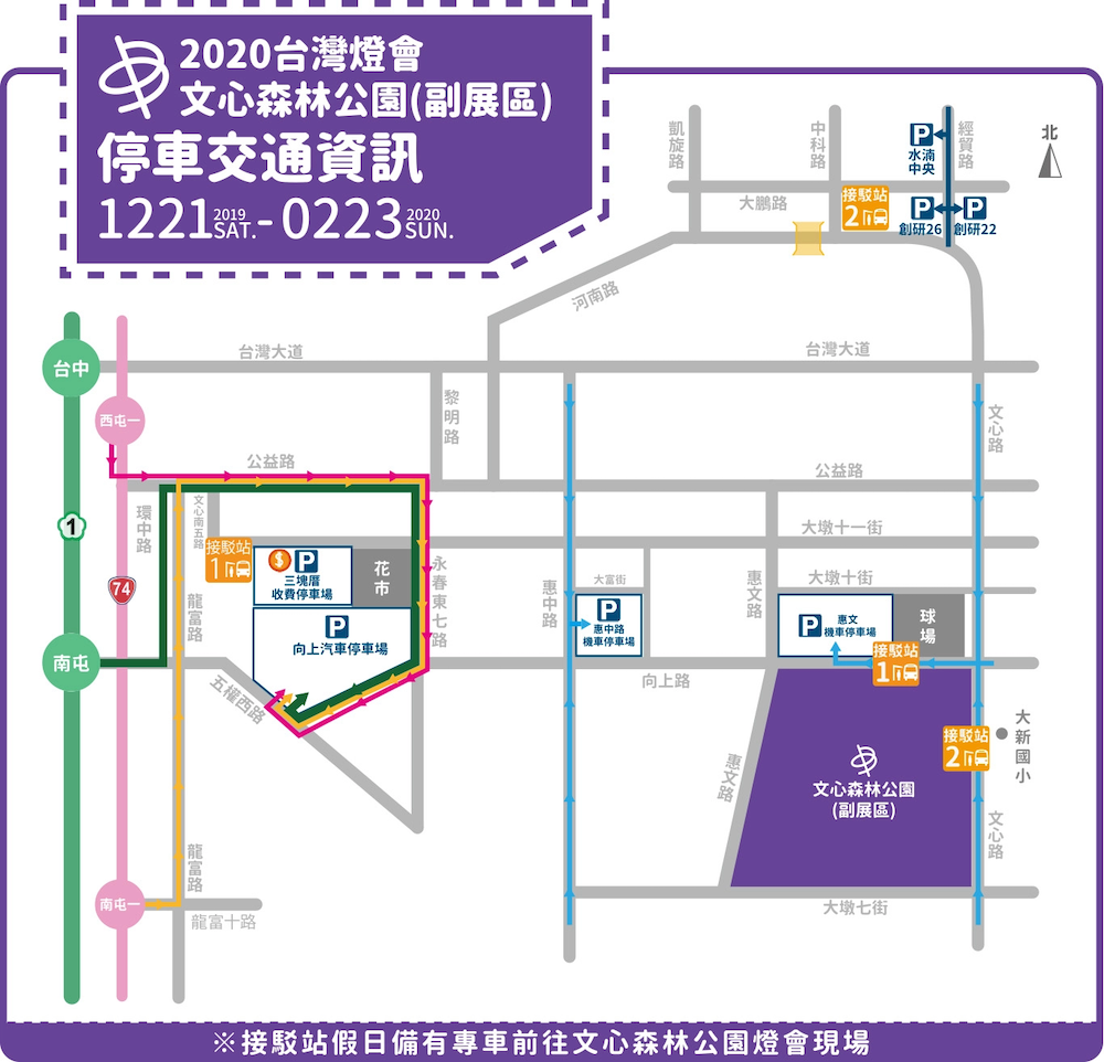 ▼為了因應到時候的人潮,主辦方也提前規劃好兩大停車場,分別是向上停車場(文心南五路/永春東七路)、南水湳停車場(經貿路/河南路)。機車也有文心森林公園旁的惠文機車停車場。