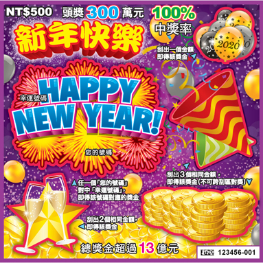 ▼而每張售價500元的「新年快樂」刮刮樂,中獎率高達100%,代表只要有買就會中!玩法則是搭配「一刮即中」、「刮六中三」及「對幸運號碼」等多元玩法,共有5個遊戲刮區,提供高達14次中獎機會,總獎項超過400萬個、總獎金超過13.9億元!
