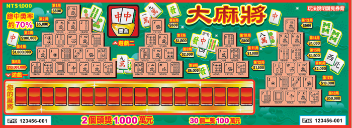 ▼其中「大麻將」的除了有2個頭獎1000萬元之外,還有,30個二獎100萬元,總獎金超過25.8億元,中獎率為70.06%。而大麻將的玩法也很簡單,只要刮區中只要任一局的麻將符號皆出現在「您的麻將」區,就可以獲得該區的獎金;而刮區中只要刮出兩個相同的麻將符號,也可以獲得獎金1000元!