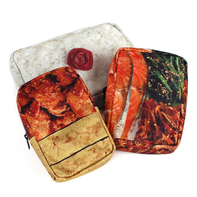 這款日式便當造型的後背包,原來是一個大的透明包包,搭配三個體積較小的白飯、雞肉和鮭魚蔬菜小包包所組合而成的,非常適合經常忘記東西放在哪、喜歡分類的人使用!