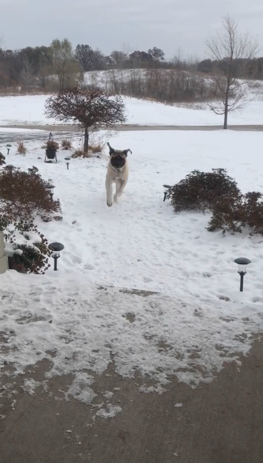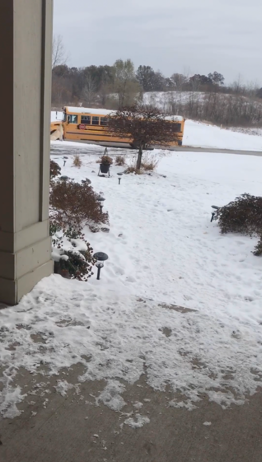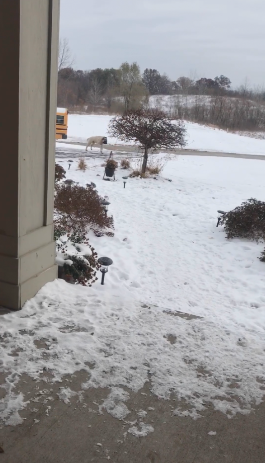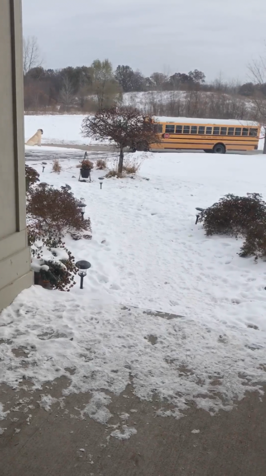 ▼只要校車離開後,牠才願意跑回家裡取暖!