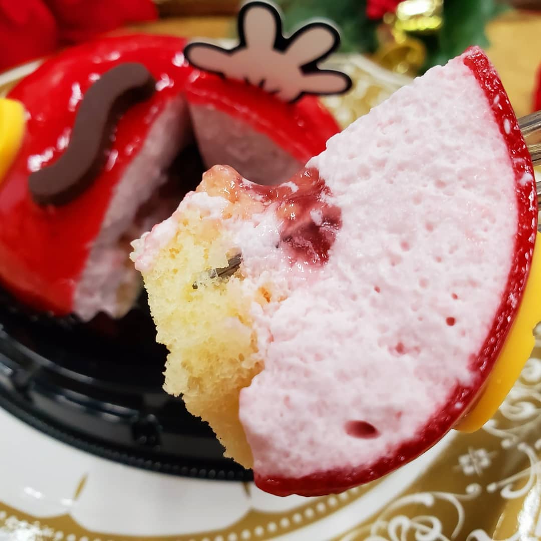 ▼米奇屁屁的鞋子跟尾巴是用巧克力做成,兩種巧克力有不同風味;而內餡則是草莓慕斯、草莓果醬、海綿蛋糕和餅乾,口感豐富、滋味酸甜而不膩,原來米奇這麼好吃啊~