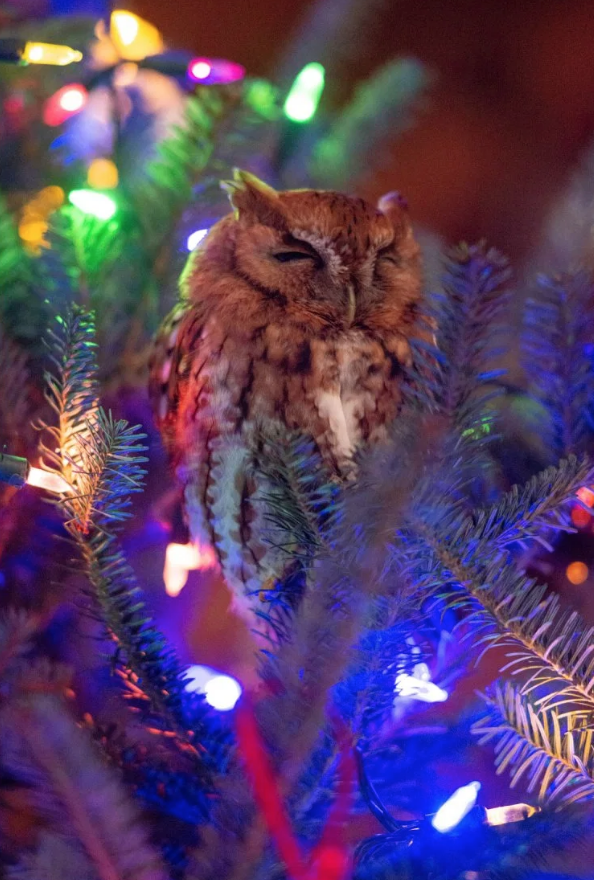自來貓頭鷹躲聖誕樹「睡搞搞」 小女孩被嚇到大叫媽媽:牠轉頭盯著我看