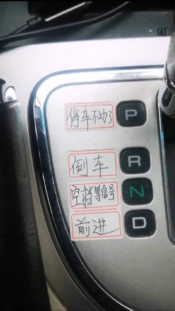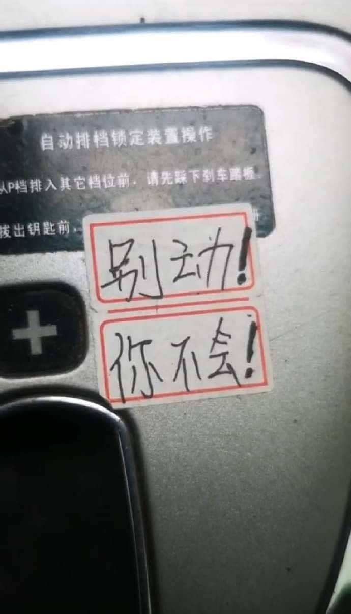 ▼車內排檔的位置貼滿提示標籤,有「停車不動了」、「倒車」、「空檔等信號」、「前進」,還有一個超搞笑的標籤上寫著:「別動!你不會!」驚嘆號那麼粗,看來真的很用心啊。