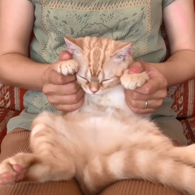 ▼貓咪坐在主人的腿上,全身軟綿綿,任由主人幫自己按摩。