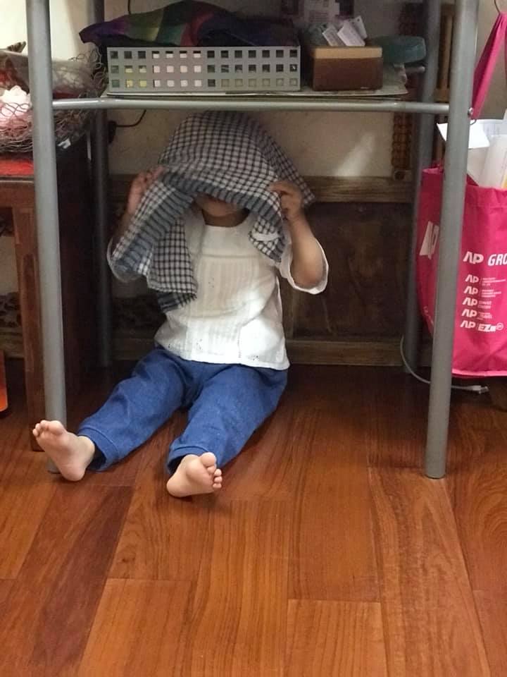 ▼一位網友在社群網路上po出孩子玩躲貓貓的照片,笑說:「跟小孩玩躲貓貓真的會玩到懷疑人生,這種感覺只要是當媽的都會秒懂啊!」