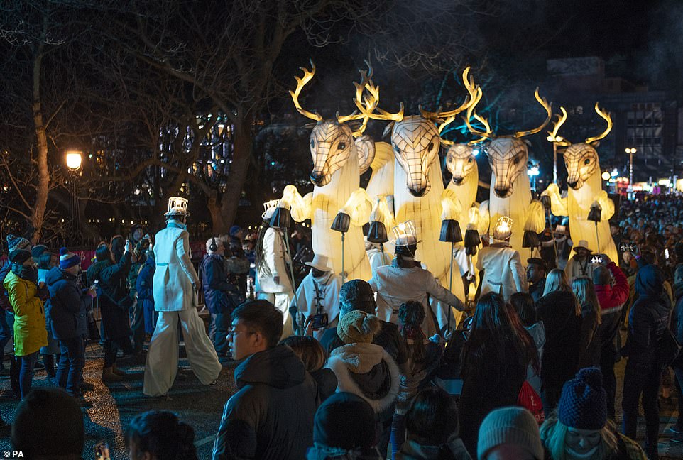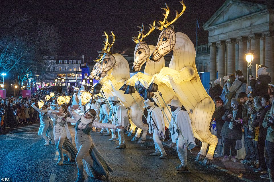 ▼近4萬人參加愛丁堡的夜間巡遊,表演者盡情跳舞,人們在道路兩旁觀賞。