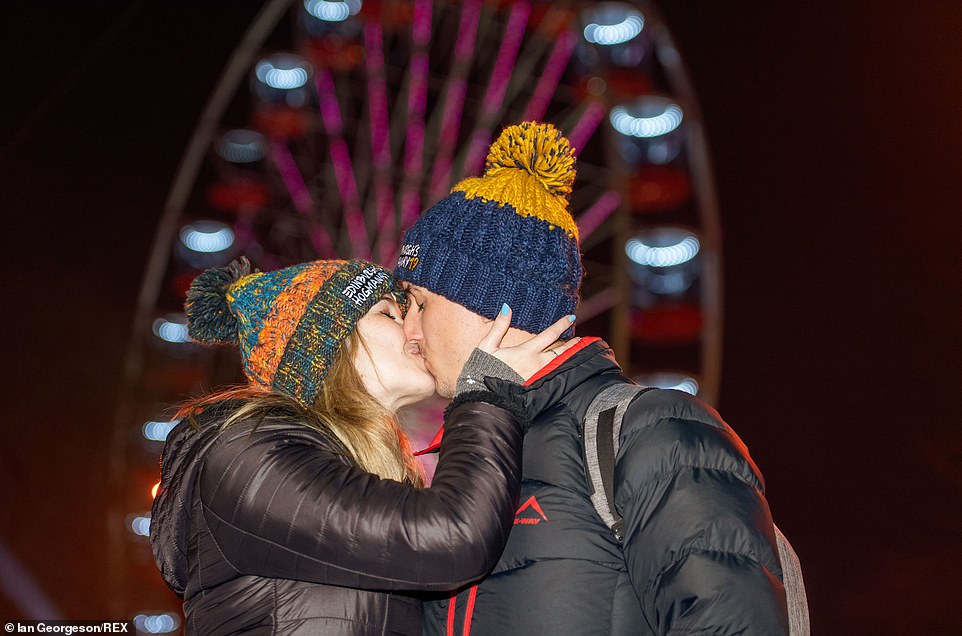 ▼人們上街慶祝新年,情侶們在煙花下浪漫接吻。