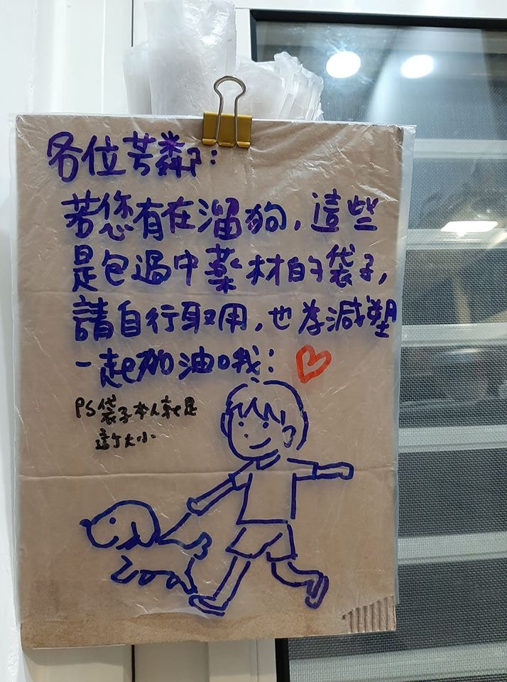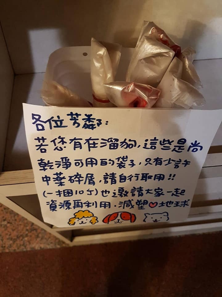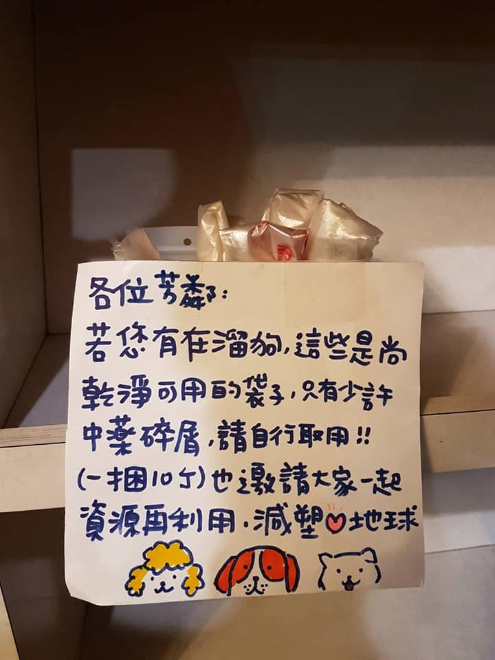 ▼女網友貼心留下字條,說:「若您有在遛狗,這些是尚乾淨可用的袋子,只有少許中藥碎屑,請自行取用!也邀請大家一起資源再利用,減塑愛地球。」