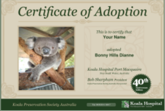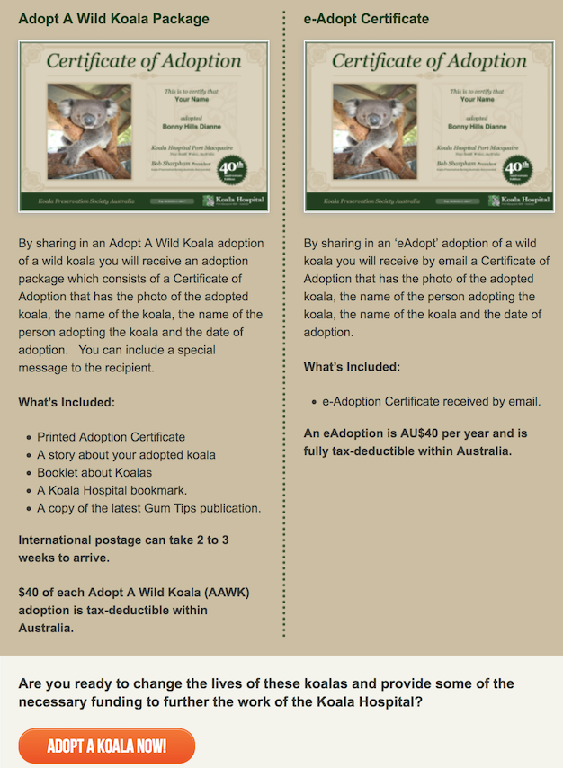 「Adopt A Wild Koala Package」是60澳元的助養計劃,付款後可以收到實體助養證書、無尾熊小冊子、領養的無尾熊簡介、無尾熊醫院書籤等等。