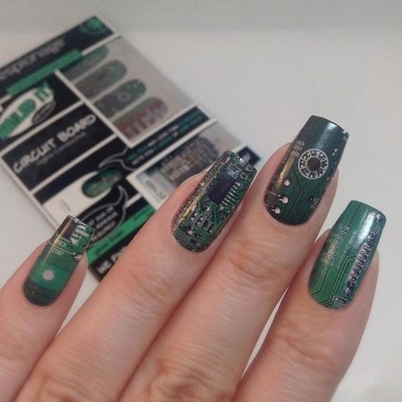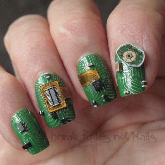 ▼國外美甲師將電路板上的零件拆解下來,粘貼在光療指甲上,看起來科技感十足。還可以通過描繪,或者選擇美甲貼來呈現特別的視覺效果。