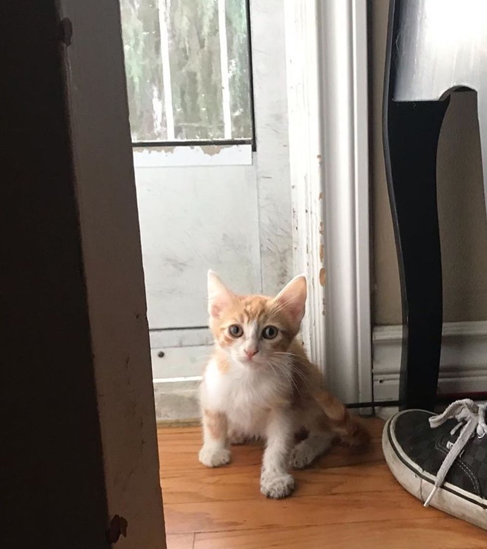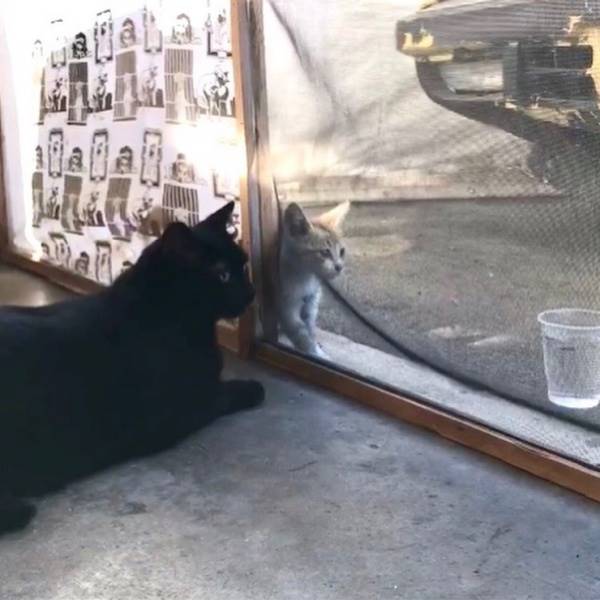 2020年01月15日緣分很奇妙!加州長灘(Long Beach)男子Justin LaRose在當地開了一間木材店,去年9月,他工作時突然聽到一陣小貓的叫聲。當時店貓Grizzly一動不動趴在窗邊,好像在看什麼。Justin到門口查看時,才發現外面有一隻骨瘦如柴的小貓。