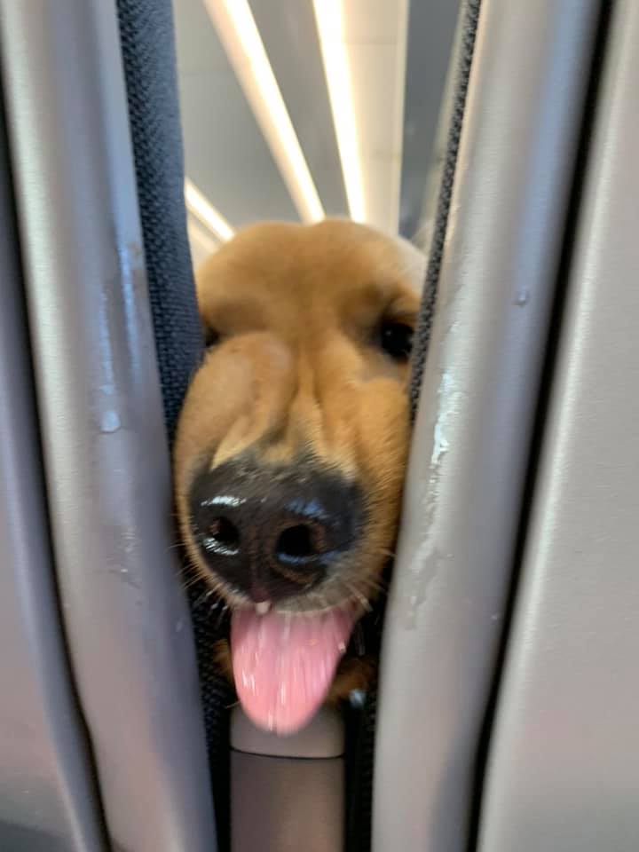▼前座的男乘客也很喜歡Huxley,漫長的旅途中有可愛的狗狗陪伴,會變得有趣很多。Daphne乾脆讓狗狗去玩,自己拿出零食開始吃。沒想到她剛剛拆開包裝袋,Huxley就聽到了。