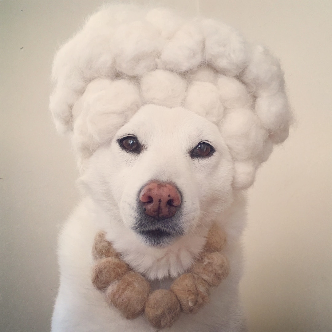 ▼之前主人為さな拍攝了一組戴白色假髮的照片。這假髮是主人收集さな掉下來的毛毛,然後用膠水黏合起來做成的。當時這曾掀起一股潮流,很多網友都學著用這樣的方法給家中的狗狗裝扮。