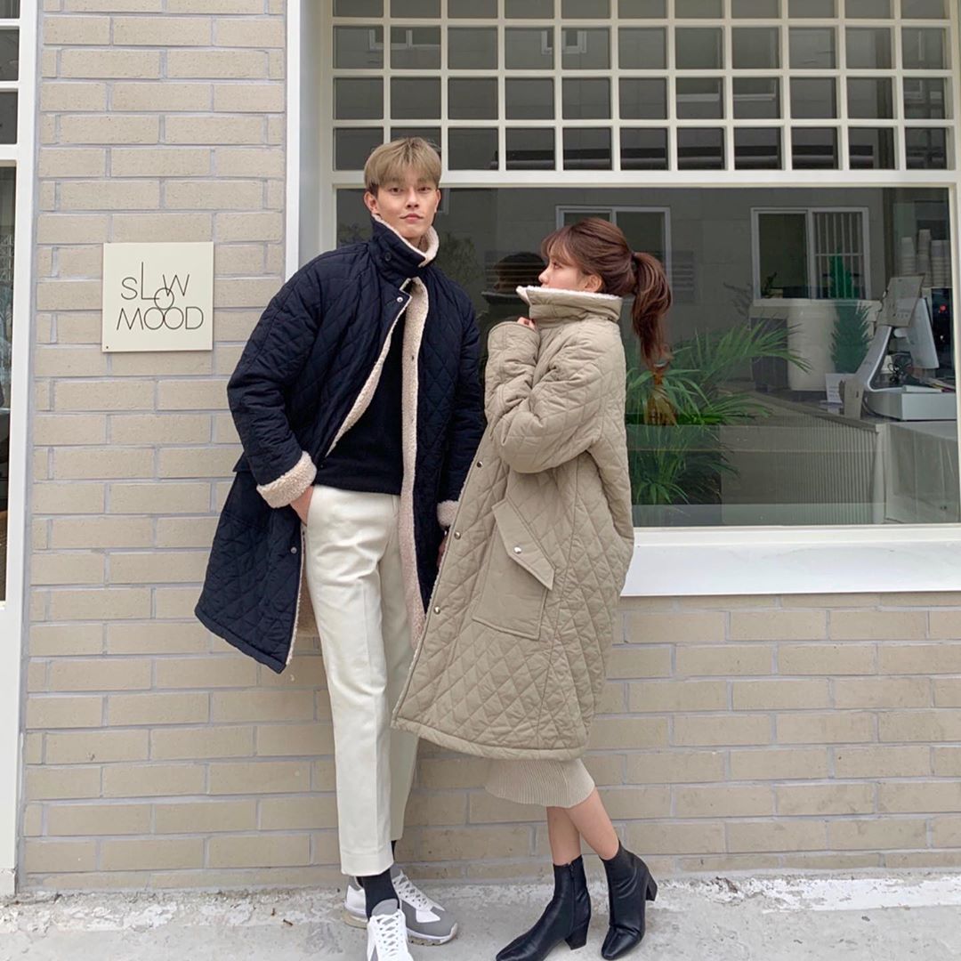 ▼天氣冷了,穿上簡單大方的厚外套。雖然是不同的顏色,但一看就是一對。
