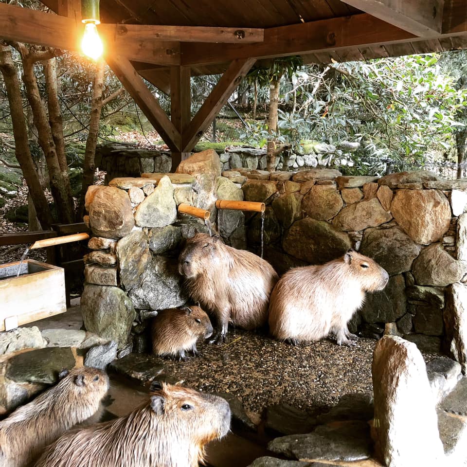 ▼3.長崎縣-BIO PARK:這是一間以「遊玩、學習、互動」為主題的體驗型動物園,動物們的生活狀態很自然,沒有被關在柵欄裡,遊客可以跟牠們互動。BIO PARK的水豚溫泉很特別,風呂池建造在類似涼亭的設施裡,遊客可以在池子旁圍觀,跟水豚之間的界線並不明顯,還能摸水豚、餵牠們吃飼料。